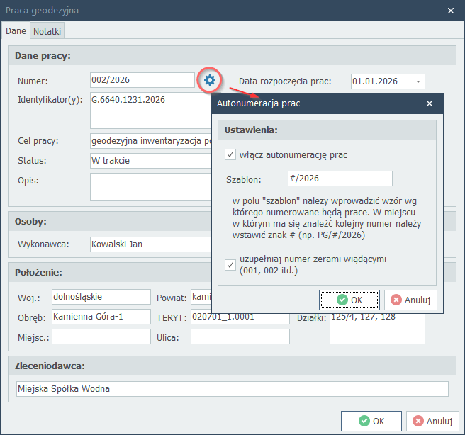 Przed dodawaniem prac należy uzupełnić słowniki (statusów, wykonawców, kierowników) oraz ustawić zasady automatycznej numeracji prac: