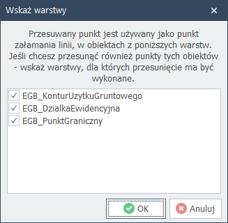 Po każdej edycji obiektu wykonywane jest sprawdzenie czy przesuwany punkt załamania obiektu jest używany w innym obiekcie mapy. Jeśli taka sytuacja ma miejsce to wyświetlane jest okno z listą takich obiektów, w którym możemy zadecydować czy zmianie ma ulec również geometria tych dodatkowych obiektów. Jest to szczególnie przydatne przy zmianie punktu granicy działki, który jednocześnie jest punktem załamania granicy użytku i/lub klasyfikacji.