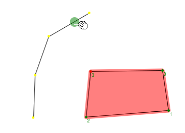 Czerwona kropka wyznacza bok, do którego dodany będzie nowy punkt (jeśli taką operację chcemy wykonać). Na rysunku powyżej kliknięcie myszką spowoduje dodanie nowego punktu załamania na linii 3-0. Jeśli chcemy dodać punkt załamania np. na linii 1-2 to należy wcześniej kliknąć na punkt oznaczony 1 (kropka z zielonej zmieni się na czerwoną).