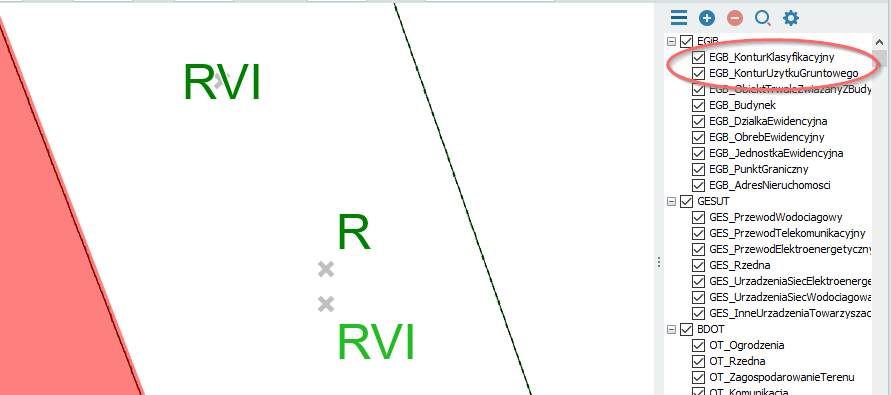 Po wybraniu tej opcji w oknie dialogowym można włączyć/wyłączyć tworzenie etykiet. Kliknięcie OK spowoduje utworzenie nowej warstwy o nazwie "Klasouzytki" oraz wstawienie etykiet na mapę. Po tej operacji na mapie będą zarówno etykiety z konturów użytków i klasyfikacji (R, RVI), jak i nowo utworzone etykiety klasoużytków (RVI). Etykiety konturów możemy wyłączyć przez wyłączenie wyświetlania warstw w legendzie: