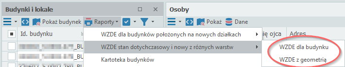 ) lub okienka "Dane". Każda modyfikacja tworzy archiwalną wersję obiektu budynku. Pozwala to na użycie raportu z tego menu: