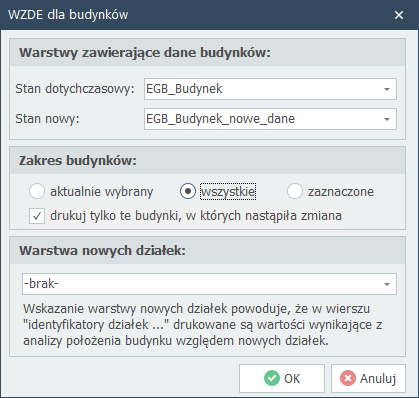 W przypadku gdy zmieniają się tylko identyfikatory działek (np. wskutek podziału działki i nadaniu nowego numeru) wystarczy, że wskażemy warstwę z nowymi działkami. Program sam wyszuka na jakich nowych działkach położony jest budynek i do stanu nowego przyjmie ich identyfikatory.