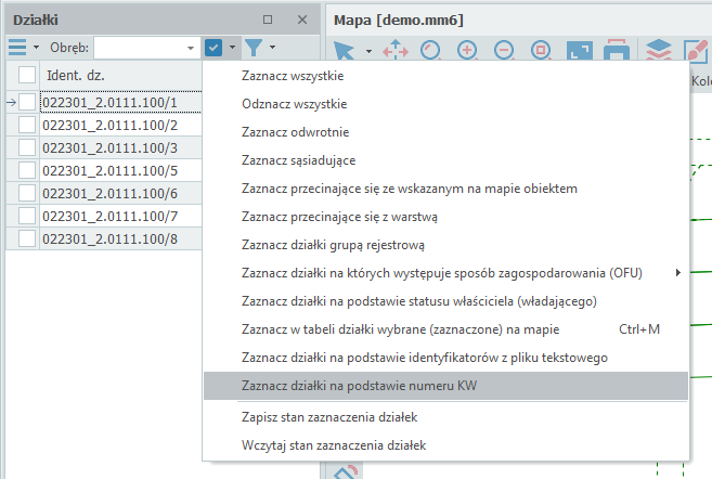 Po kliknięciu OK zaznaczone zostaną działki na podstawie wprowadzonego numeru KW. Kolejnym krokiem jest wykonanie opcji wypełnienia kolorem zaznaczonych działek: