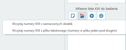 Badanie KW można również przeprowadzić dla własnej listy numerów. Listę taką należy utworzyć w okienku "Własna lista KW do badania". Numery KW można wprowadzać ręcznie, lub skorzystać z opcji wczytania z zaznaczonych działek lub z pliku tekstowego.
