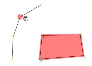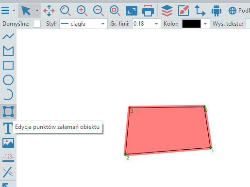 Czerwona kropka wyznacza bok, do którego dodany będzie nowy punkt (jeśli taką operację chcemy wykonać). Na rysunku powyżej kliknięcie myszką spowoduje dodanie nowego punktu załamania na linii 3-0. Jeśli chcemy dodać punkt załamania np. na linii 1-2 to należy wcześniej kliknąć na punkt oznaczony 1 (kropka z zielonej zmieni się na czerwoną).