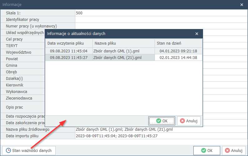 i najczęściej umieszczany jest na początku pliku. Program Mapa.m6 (od wersji 28) odczytuje datę z tego komentarza (lub jeśli jej brak przyjmuje systemową datę utworzenia pliku GML) i umieszcza ją w oknie informacji. Ponieważ do projektu można wczytać kilka plików GML, informacje o dacie pozyskania danych, wyświetlane są dla każdego pliku oddzielnie: