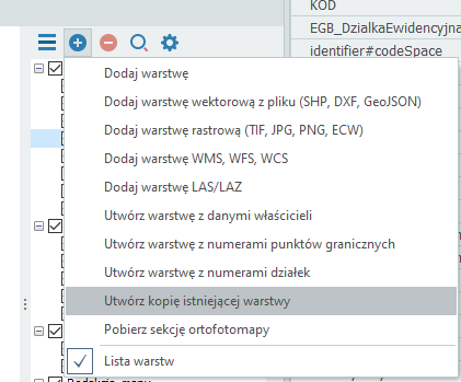 1. Tworzymy kopię warstwy EGB_Budynek. W tym celu należy użyć opcji dostępnej w menu "Legendy":