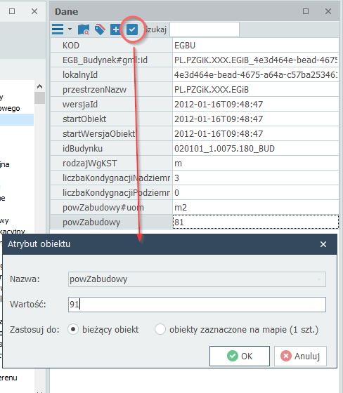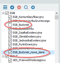 2. Kolejnym krokiem będzie modyfikacja atrybutów budynku. Żeby przypadkiem nie zmienić danych źródłowych dobrze jest wyłączyć z widoku warstwę "EGB_Budynek":