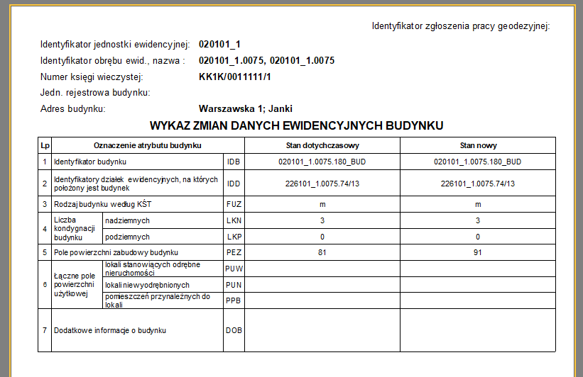 ) lub okienka "Dane". Każda modyfikacja tworzy archiwalną wersję obiektu budynku. Pozwala to na użycie raportu z tego menu: