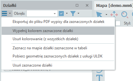 Po kliknięciu OK zaznaczone zostaną działki na podstawie wprowadzonego numeru KW. Kolejnym krokiem jest wykonanie opcji wypełnienia kolorem zaznaczonych działek: