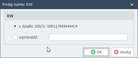 W oknie dialogowym mamy możliwość wyboru numeru KW z aktualnie podświetlonej na liście działki lub też wpisanie numeru KW ręcznie: