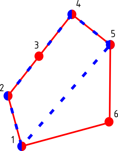 Na powyższym rysunku mamy 2 obiekty: czerwony i niebieski. Punkt numer 3 należy do obiektu czerwonego, a nie jest włączony w obiekt niebieski. Jeśli jednocześnie odległość tego punktu od linii 2-4 jest mniejsza od zadanej jako kryterium, to taki przypadek zostanie wyszukany i ukazany w tabeli jako wynik analizy:
